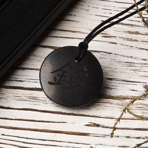 Кулон шунгит Россия круг с гравировкой Фен-Шуй "Деньги" 3 см