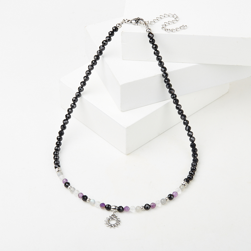 Чокер микс аметист, горный хрусталь, лабрадор, турмалин (шерл) (сталь хир.) огранка 4 мм 39 см (+7 см)