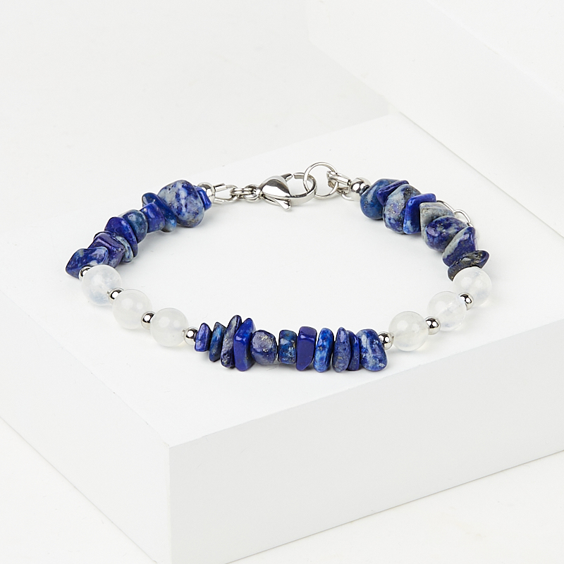 Браслет микс лазурит, лунный камень (сталь хир.) 6 мм 17 см (+3 см)