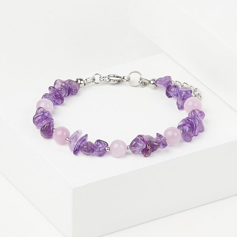 Браслет микс аметист, кунцит (сталь хир.) 6 мм 17 см (+3 см)