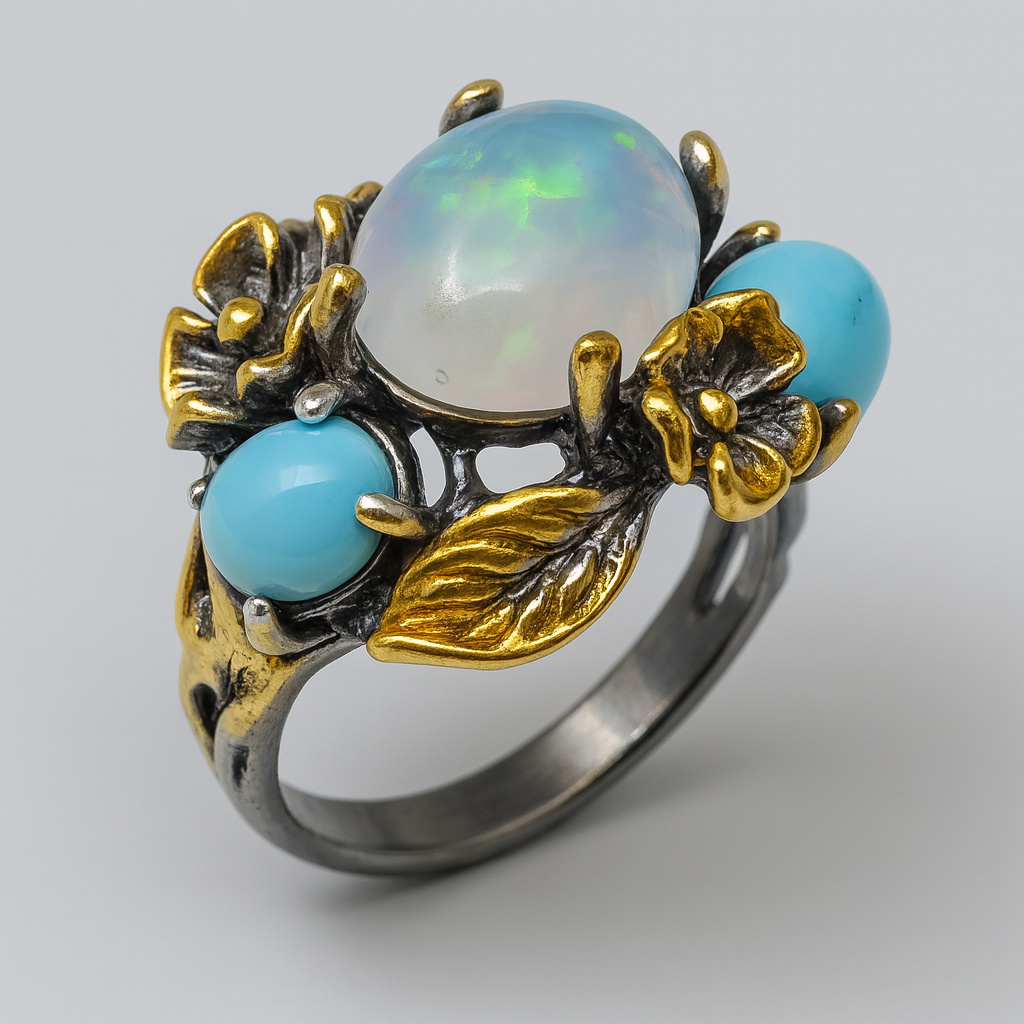 Кольцо микс бирюза, опал (серебро 925 пр. позолота, родир. черн.) размер 18,5