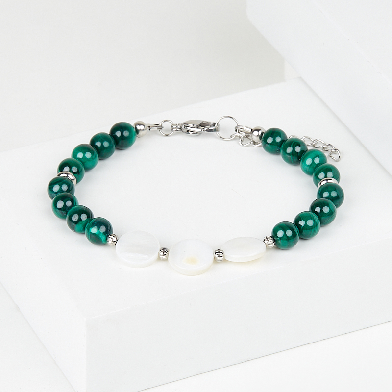 Браслет микс малахит, перламутр (сталь хир.) 16 см (+3 см)