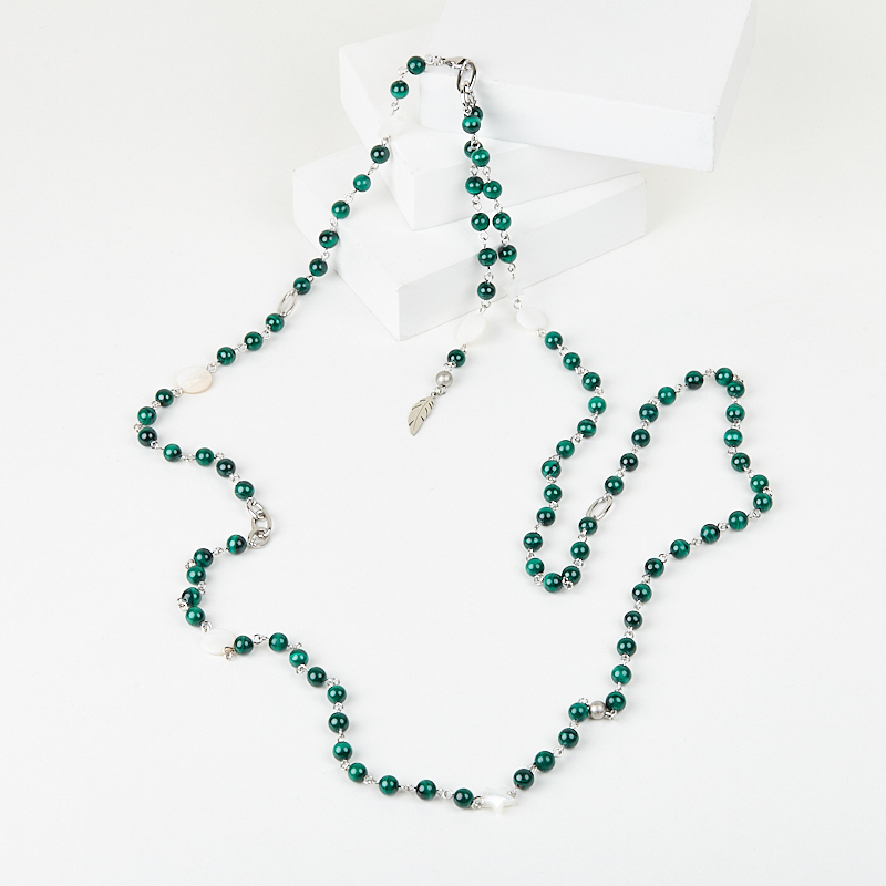 Колье микс малахит, перламутр (сталь хир.) 124 см (+7 см)