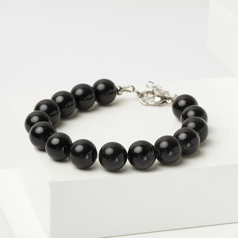 Браслет турмалин черный (шерл) Бразилия (сталь хир.) 10 мм 16 см (+3 см)
